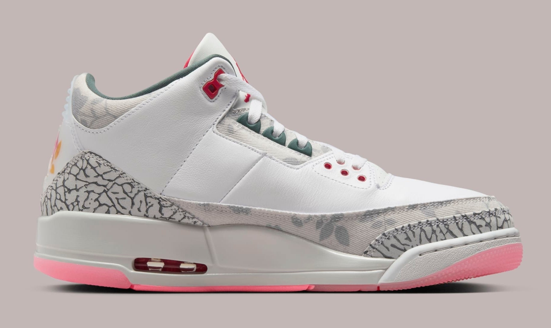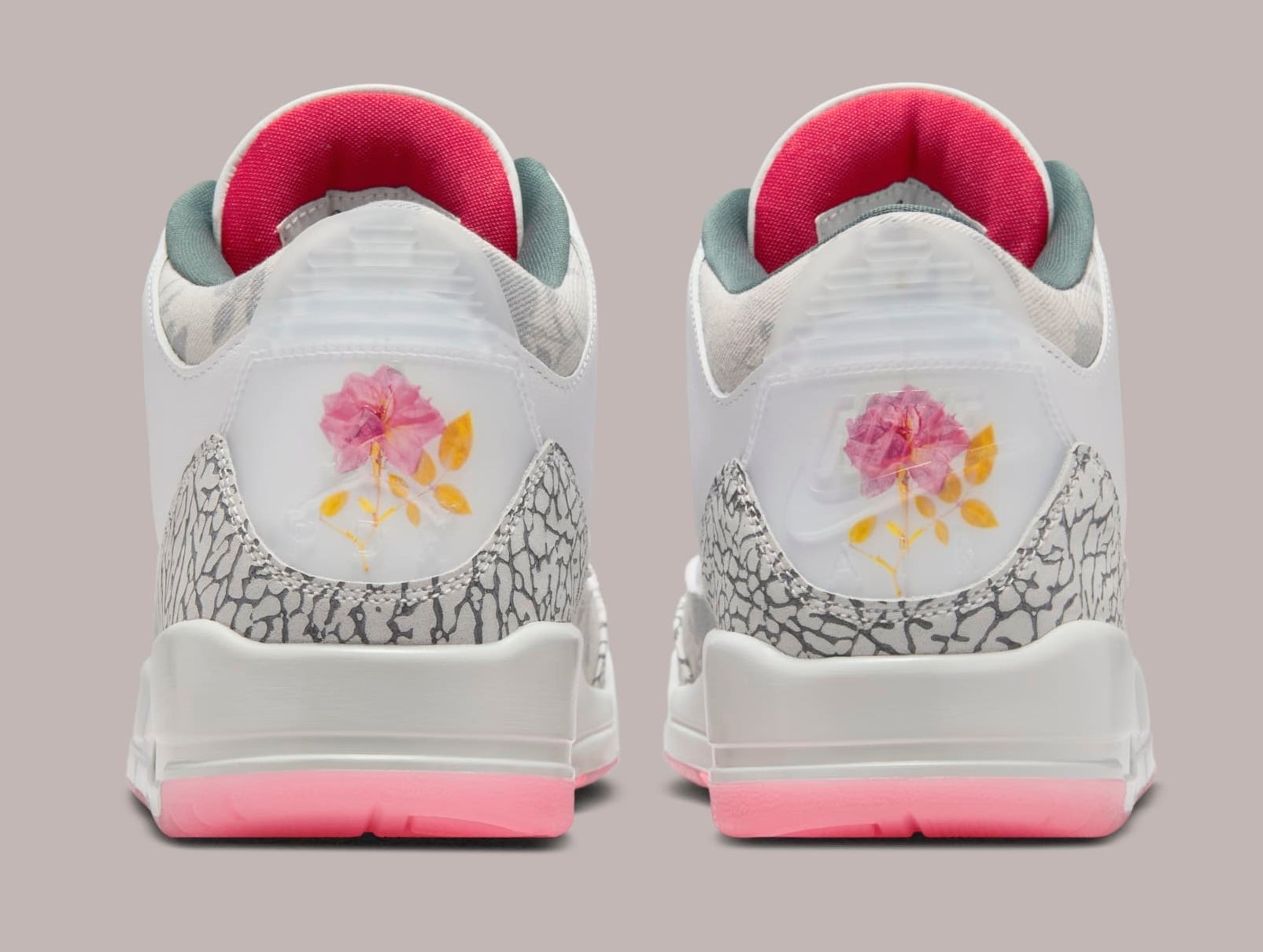 The "Wings" Air Jordan 3 features a fairly subtle color blocking, starting with white leather for the base of the upper. Complementing the look are decorative floral-printed overlay panels on the eyestay, mudguard, and collar. Additional details include the quote "Up, rose" and "I too, have thorns" behind the tongues, as well as a rose graphic embedded within the heel tab. Completing the look is the silhouette's signature elephant print panels at the forefoot and heel, while a translucent pink outsole sits below. The shoe also has a special "Wings"-branded hangtag, as seen in the images below.
